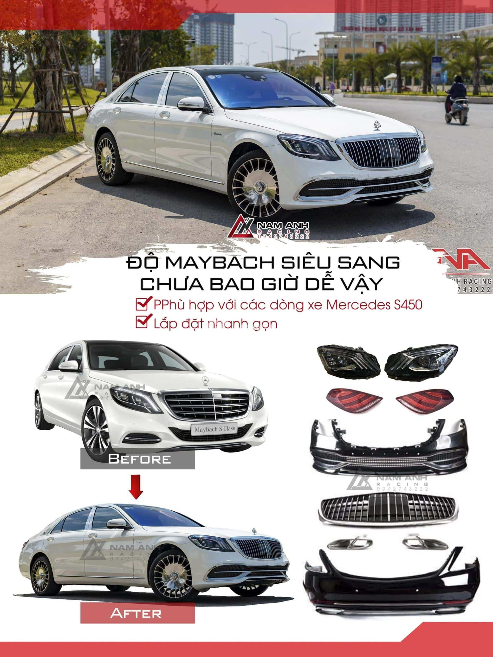 Nâng đời bodykit maybach cho s-class w222 chưa bao giờ dễ dàng đến thế, chỉ cần thay cản trước , cản sau, mặt calang, đèn pha đèn hậu kèm phụ kiện và logo đầy đủ để hô biến chiếc xe của bạn trở nên sang trọng hơn gấp bội phần.